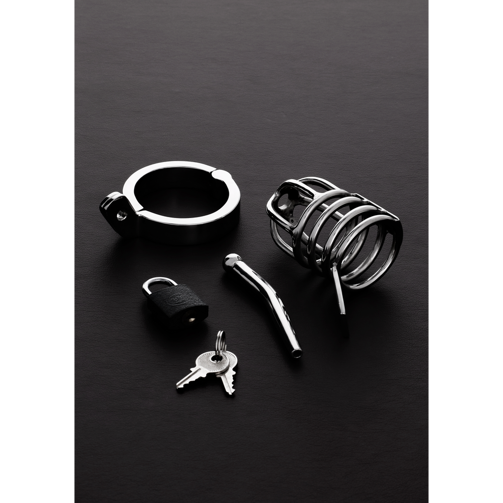 Ved at bære The Attica Chastity Cage vil det føles som en fængselscelle for din penis, under din kontrol. Fremstillet af rustfrit stål og designet med en buet rygrad, indkapslingsringe og en aftagelig penisplug. Du skal blot placere ham i buret og fastgøre basisringen bag testiklerne og derefter låse ham inde med det medfølgende låse- og nøglesæt.