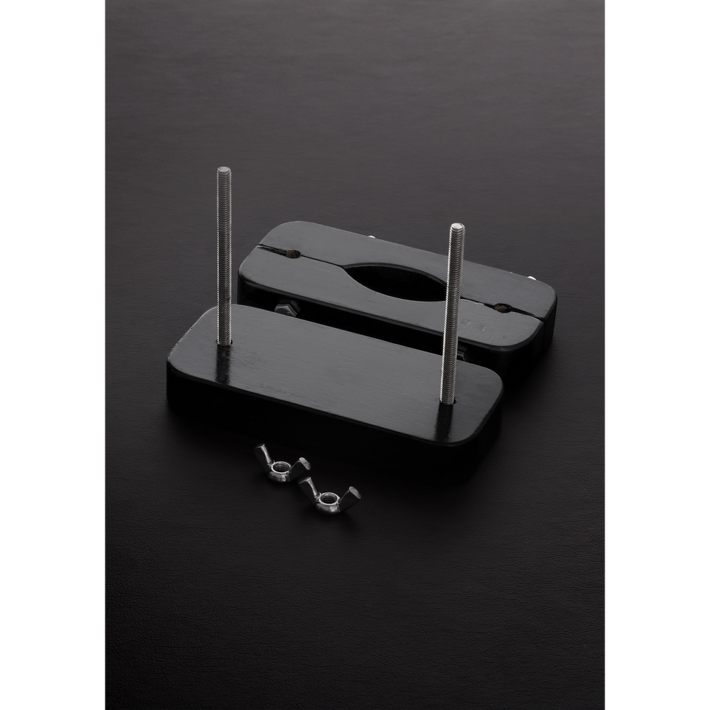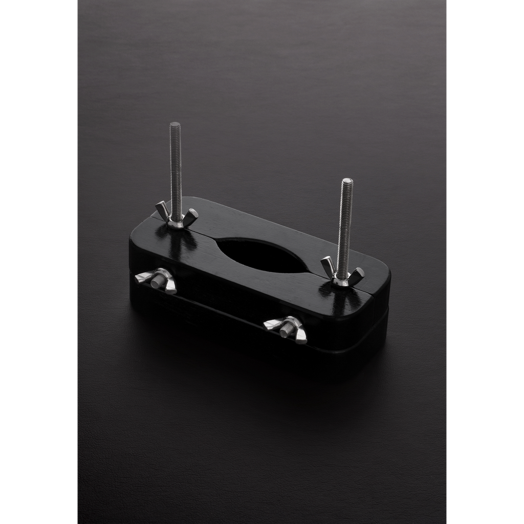 Mens Humbler begrænser hans bevægelser, giver Ball Buster ham en vis frihed til at nyde den lækre fastspænding af hans testikler. Med fire vingemøtrikker til at justere trykket og følelsen tilbyder Ball Buster Testicle Vice en bred vifte af stimulering - alt sammen ved at dreje på en skrue! Denne patenterede testikelskrue er fremstillet i træ og lakeret i sort, og den er fuldt justerbar, både når man anvender Ball Buster, og når man justerer trykket på testiklerne.