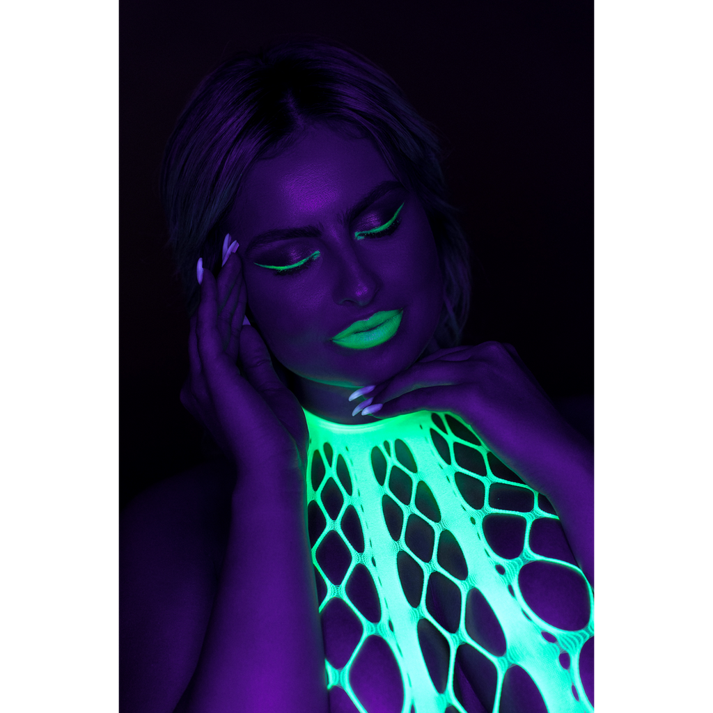Vores Neon-undertøj er den perfekte tilføjelse til din samling. De er lavet af behagelige, elastiske materialer, der er nemme at passe, og de er designet til at passe perfekt til din krop. Uanset om du bruger dem som festtøj eller lingeri, vil dette iøjnefaldende stykke sørge for, at du skiller dig ud! Slip din indre gudinde løs med dette fantastiske UV-aktiverede lingeri. Denne smukke bodystocking har en opsigtsvækkende halterneck og en lav rygudskæring. Et fantastisk festtøj, der giver dig wow-faktor og får dig til at skille dig ud. De UV-aktiverede materialer tilføjer et strejf af mystik og tiltrækningskraft. Let at passe på grund af de strækbare materialer, der får dig til at lyse op i natten. Fås i neonpink og neongrøn. Størrelserne går fra XS/XL til XL/XXXXL