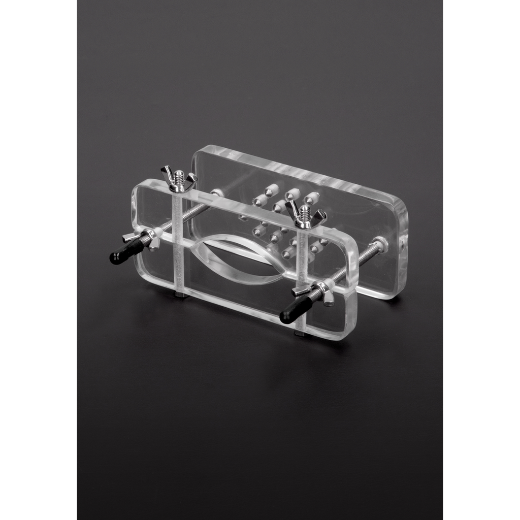 Den klare akryl er fantastisk, let og med glatte kanter. Hans pik bliver hård i forventning om den solide akrylplade, der rejser sig og truer med at knuse hans nosser. Drej de to skruer på bundpladen, og se hans øjne blive større, når han begynder at mærke presset. Det varer ikke længe, før bare en brøkdel af en drejning får ham til at gispe og tigge om nåde. Den klare akryl giver dig et godt udsyn til hans fladtrykte nødder fra alle vinkler - STØRRELSE: Indvendig diameter: Testikelmanchet: 5,1 cm (2 tommer) x 2,64 cm (1 tomme) x Længde: 5 tommer x Bredde: 2,5 tommer