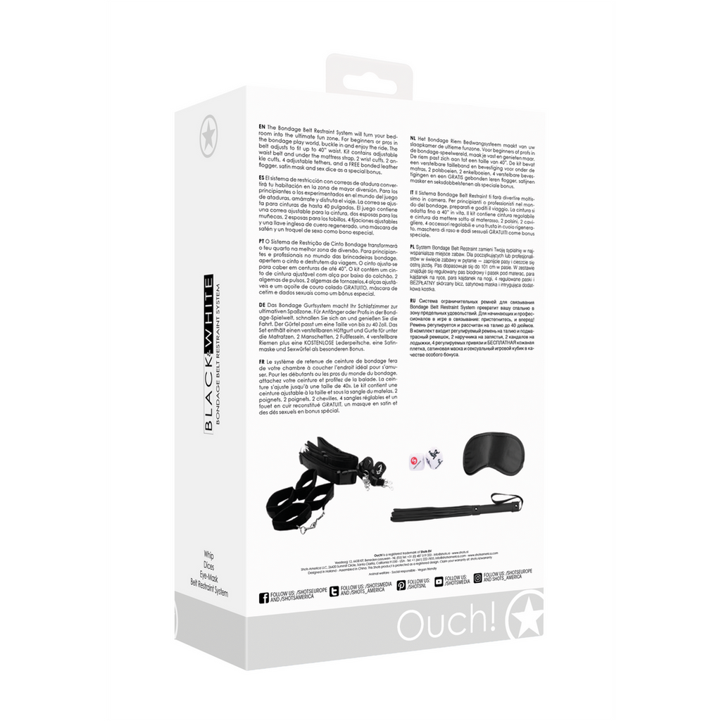 Bondage Belt Restraint System vil forvandle dit soveværelse til den ultimative fun-zone. Uanset om du er nybegynder eller professionel i bondageverdenen, kan du spænde dig fast og nyde turen. Bæltet kan justeres til at passe op til 40 i taljen. Sættet indeholder justerbart taljebælte og rem under madrassen, 2 håndledsmanchetter, 2 ankelmanchetter, 4 justerbare tøjler og en GRATIS læderflogger, satinmaske og sexterning som en særlig bonus.