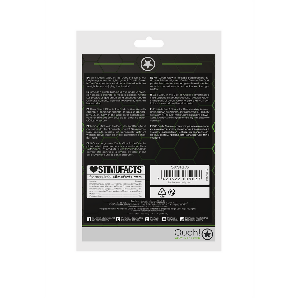 Av! Glow in the Dark, fremtiden for bondage er her. Designet med en autentisk bondage-æstetik, men med den ekstra glæde ved de selvlysende egenskaber, vil de fluorescerende grønne detaljer gøre enhver begivenhed til en fest. Med Ouch! Glow in the Dark er det sjove kun lige begyndt, når lyset slukkes. Dette sæt pikringe indeholder tre ringe i forskellige størrelser, som er behagelige og strækbare. Ringene vil forbedre din seksuelle ydeevne og give dig masser af muligheder på grund af deres fleksibilitet. Av!Glow-In-The-Dark-produkter skal aktiveres med sollys, før de kan nydes i mørket.
