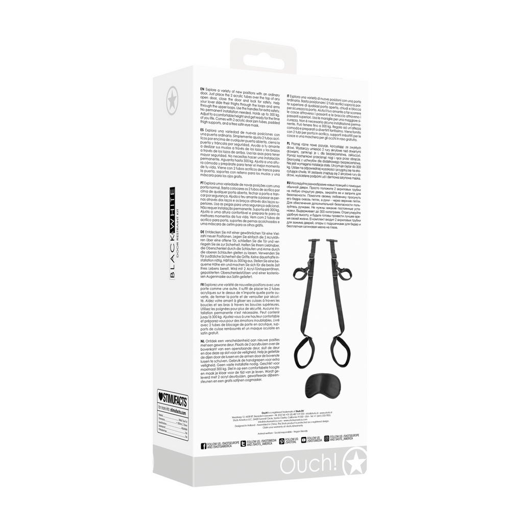 Udforsk en række nye positioner med en almindelig dør. Bare placer de 2 akrylrør over toppen af en åben dør, luk døren, og lås den for en sikkerheds skyld. Hjælp din kæreste med at skubbe lårene gennem løkkerne og armene gennem de øverste løkker. Brug håndtagene for ekstra sikkerhed. Ingen permanent installation nødvendig. Holder op til 300 kg/661 lbs. Juster til en behagelig højde, og gør dig klar til den bedste tid i dit liv. Leveres med 2 dørkarmrør i akryl, polstrede lårstøtter og en gratis øjenmaske i satin.