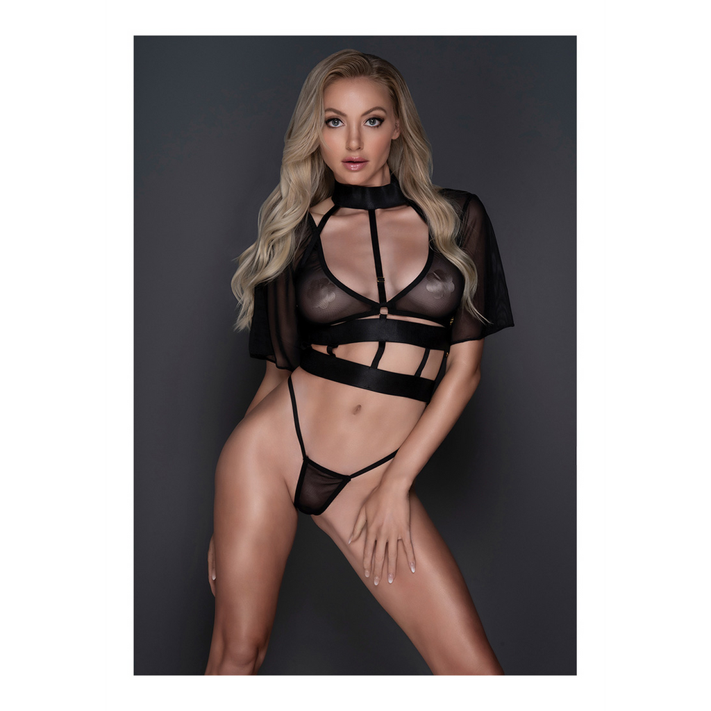 Uforskammet design, der driller, giver minimal dækning med maksimale resultater. Den gennemsigtige mesh-top er smeltet sammen med kantede, tykke stropper for at gøre dette til et chokerende sexet, men finurligt stykke. Justerbar åbning med krog bagpå. Leveres med en g-streng i ren mesh.