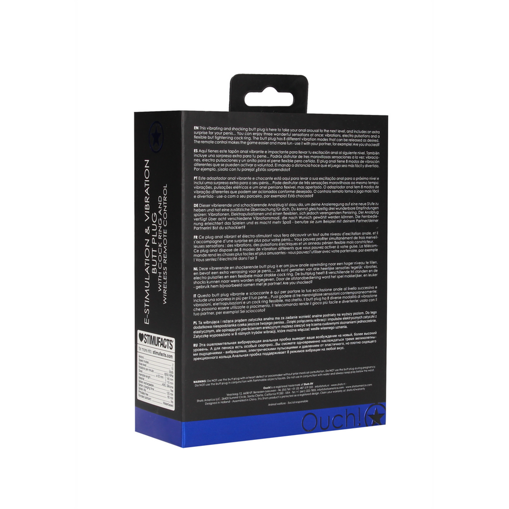 Denne vibrerende og chokerende buttplug er her for at tage din anale ophidselse til det næste niveau, og den indeholder en ekstra overraskelse til din penis... Du kan nyde tre vidunderlige fornemmelser på én gang: vibrationer, elektriske pulseringer og en fleksibel, men strammende pikring. Takket være dens anatomiske form stimuleres prostata på en behagelig måde, og din orgasme bliver simpelthen lækker! Fjernbetjeningen gør legen nemmere og sjovere - brug den f.eks. sammen med din partner! Er du chokeret?