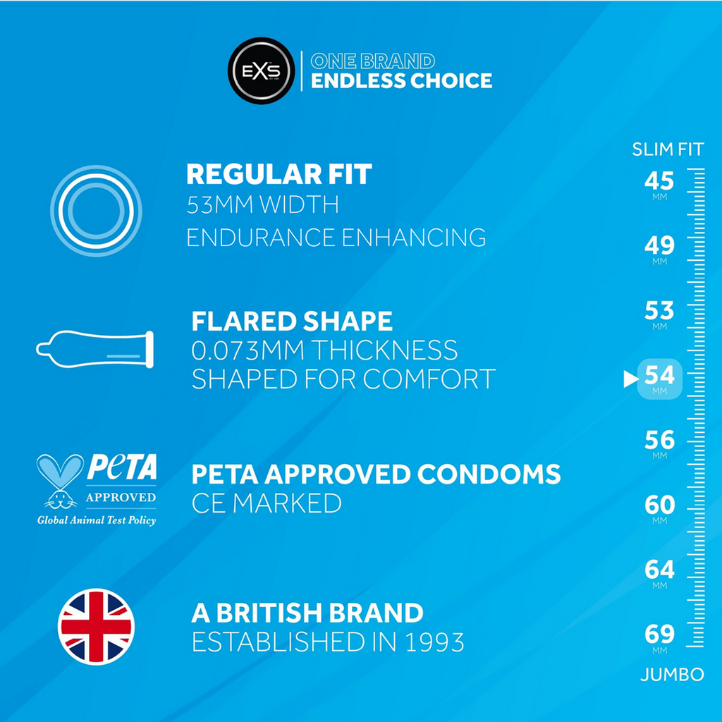 Kondom af naturlatex, med pattespids og silikonesmøringEXS Endurance Delay-kondomer er 53 mm med lige vægge og fremstillet af naturlatex. Hvert kondom er smurt på ydersiden (selv om det kan være nødvendigt med ekstra glidecreme) og har en bedøvende glidecreme med 1 % lidokain på indersiden, som skal masseres ind på penishovedet. EXS Endurance Delay-kondomer får dig til at holde længere, når du elsker!