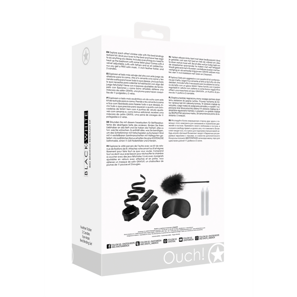 Udforsk hinandens mere kinky sider med dette sengebindingssæt. Bind din elsker til sengen, og få frit spil til at gøre, hvad du har lyst til. Indeholder alt, hvad du skal bruge for at varme soveværelset op med lidt fetish-leg! Leveres med 4 justerbare fløjlsmanchetter med bånd, og som en ekstra bonus får du en GRATIS satinmaske, 11 tommer fjerkiler og 2 stearinlys.