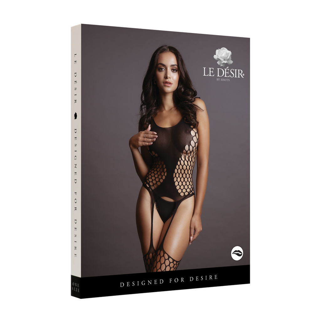 Suspender-bodystocking med stort hegnsmønster. Denne bodystocking har masser af stretch og kan bruges fra størrelse S til XL.