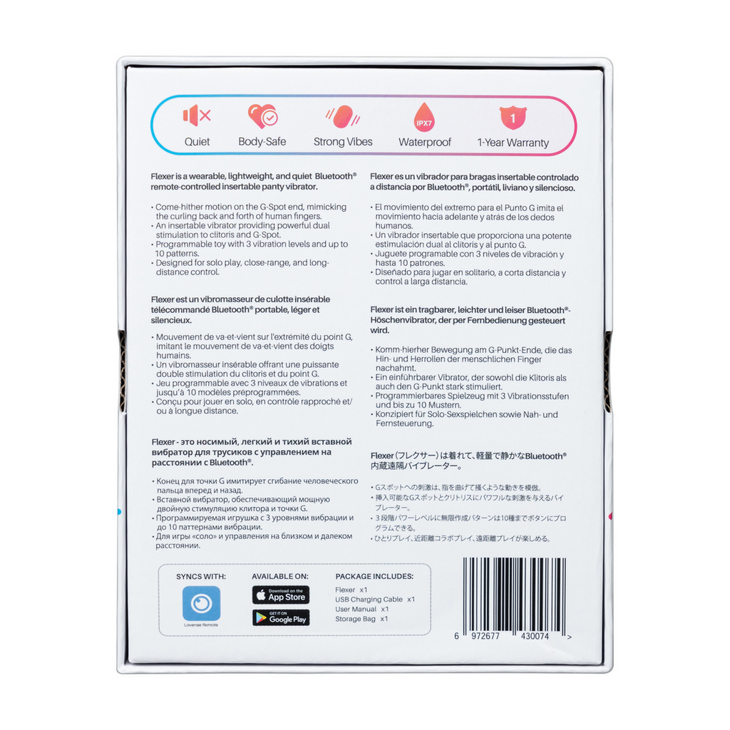 Flexer er en alsidig 3-i-1 butterfly-vibrator, der kombinerer klitoris-, G-punkts- og vaginalstimulering. Dens ergonomiske, buede design sikrer en sikker pasform, der bliver på plads, mens de kraftige vibrationer stimulerer alle tre områder for en mere tilfredsstillende oplevelse. Lovense Remote App giver mulighed for kontrol i realtid, hvilket gør den perfekt til par på lang afstand eller sololeg. Vibratorens brugerdefinerede vibrationsindstillinger omfatter lav, mellem og høj med mulighed for at gemme op til 10 personlige vibrationsmønstre. Den synkroniserer også med musik eller omgivende lyde, hvilket skaber en dynamisk og fordybende oplevelse. Flexers stabile Bluetooth-forbindelse sikrer problemfri drift, og dens kompatibilitet med både iOS og Android gør den tilgængelig for en bred vifte af brugere.