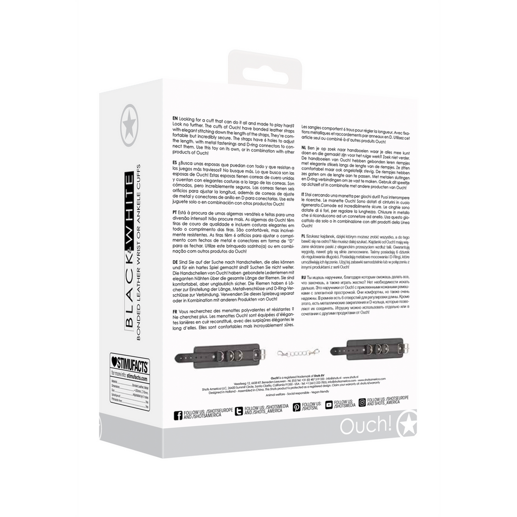 Leder du efter en manchet, der kan det hele, og som er lavet til at spille hårdt? Så behøver du ikke lede længere. Manchetterne fra Ouch! har kvalitetslæderstropper med elegante syninger i stroppernes længde, de er komfortable, men utroligt sikre. Stropperne har 6 huller til at justere længden med metalbeslag og D-ring-stik til at forbinde dem. Brug dette legetøj alene eller i kombination med andre produkter fra Ouch!