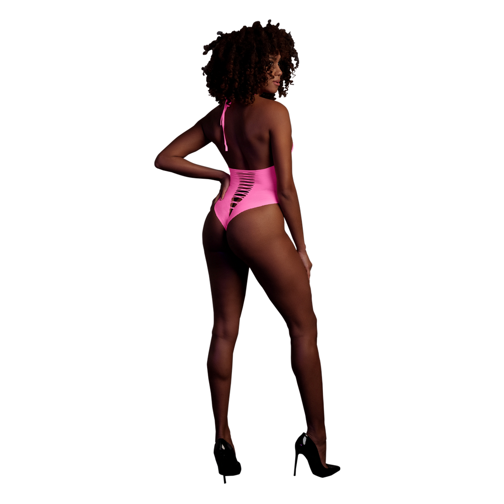 Vores Neon-undertøj er den perfekte tilføjelse til din samling. De er lavet af behagelige, elastiske materialer, der er nemme at passe, og de er designet til at passe perfekt til din krop. Uanset om du bruger dem som festtøj eller lingeri, vil dette iøjnefaldende stykke sørge for, at du skiller dig ud! Slip din indre gudinde løs med dette fantastiske UV-aktiverede lingeri. Denne smukke body har en opsigtsvækkende halterneck, der er nem at binde, og et højt snit, der skaber en illusion om en mindre talje og rundere hofter. Den åbne udskæring giver den lidt ekstra legesyge. Et fantastisk festtøj, der giver dig wow-faktor og får dig til at skille dig ud. De UV-aktiverede materialer tilføjer et strejf af mystik og tiltrækningskraft. Let at passe på grund af de strækbare materialer, der får dig til at lyse op i natten. Fås i neonpink og neongrøn. Størrelserne går fra XS/XL til XL/XXXXL