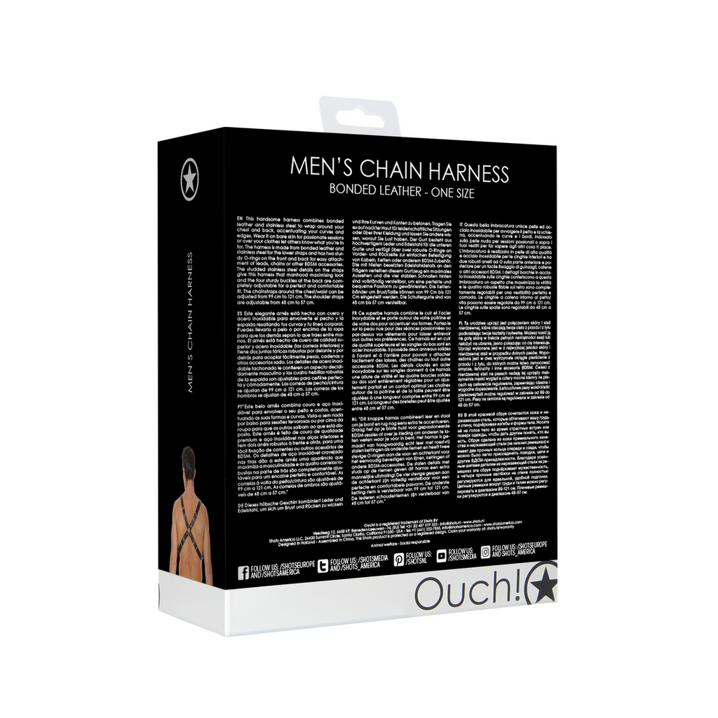 Denne flotte sele kombinerer bonded læder og rustfrit stål, så den smyger sig om dit bryst og din ryg og fremhæver dine kurver og kanter. Brug det på bar hud til lidenskabelige sessioner eller over dit tøj, så andre ved, hvad du er ude på. Selen er lavet af bonded læder og rustfrit stål til de nederste stropper og har to robuste O-ringe foran og bagpå, så du nemt kan fastgøre ledninger, kæder eller andet BDSM-tilbehør. De nittede detaljer i rustfrit stål på stropperne giver denne sele et manddomsmaksimerende look, og de fire robuste spænder bagpå er helt justerbare for en perfekt og behagelig pasform. Kæderemmene omkring brystet/taljen kan justeres fra 99 cm til 121 cm. Skulderstropperne kan justeres fra 48 cm til 57 cm.