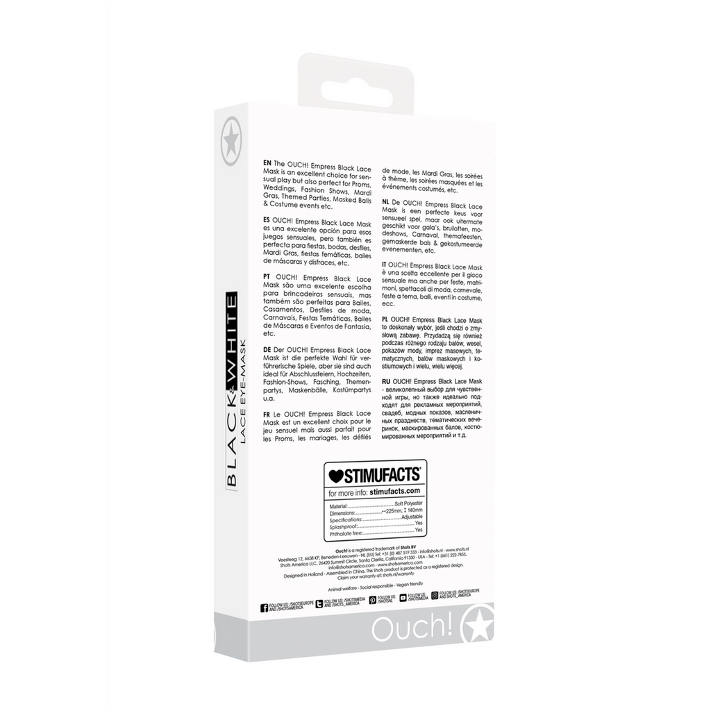 OUCH! Her er en serie på 4 håndlavede, lette og let anvendelige masker af høj kvalitet med indviklede, moderne venetiansk inspirerede designs. Disse masker er fremstillet med laserskæringsteknologi af de fineste, miljøvenlige materialer og vil virkelig give dig en stemning af forførende mystik! To kvalitetsbånd holder masken på plads til mange timers behagelig brug eller leg og gør det nemt at justere den. OUCH! Empress Black Lace Mask er et fremragende valg til sensuel leg, men også perfekt til skolebal, bryllupper, modeshows, Mardi Gras, temafester, maskeballer, kostumeevents osv.