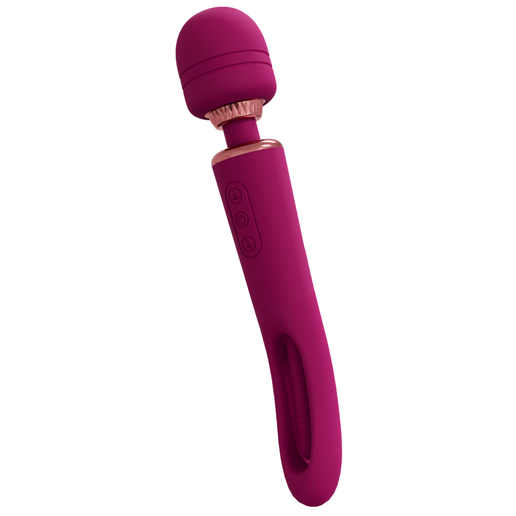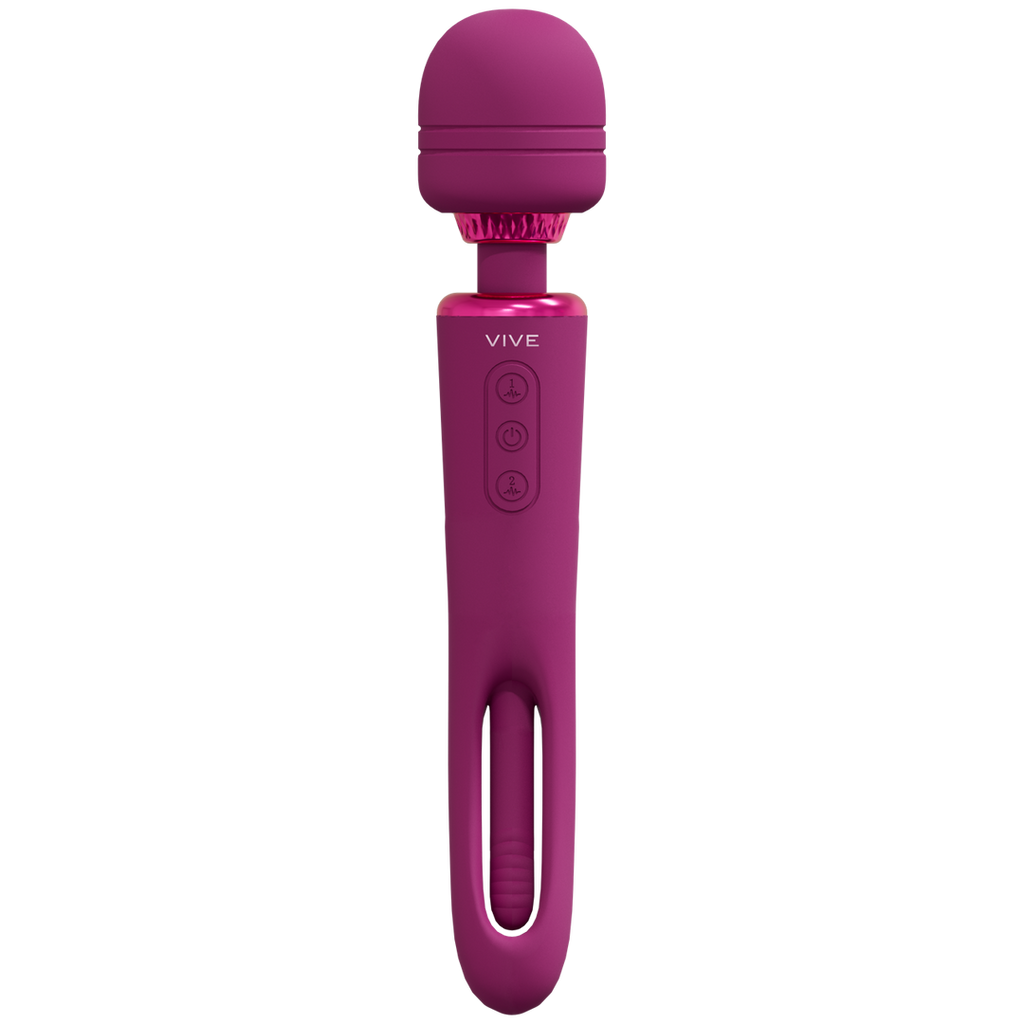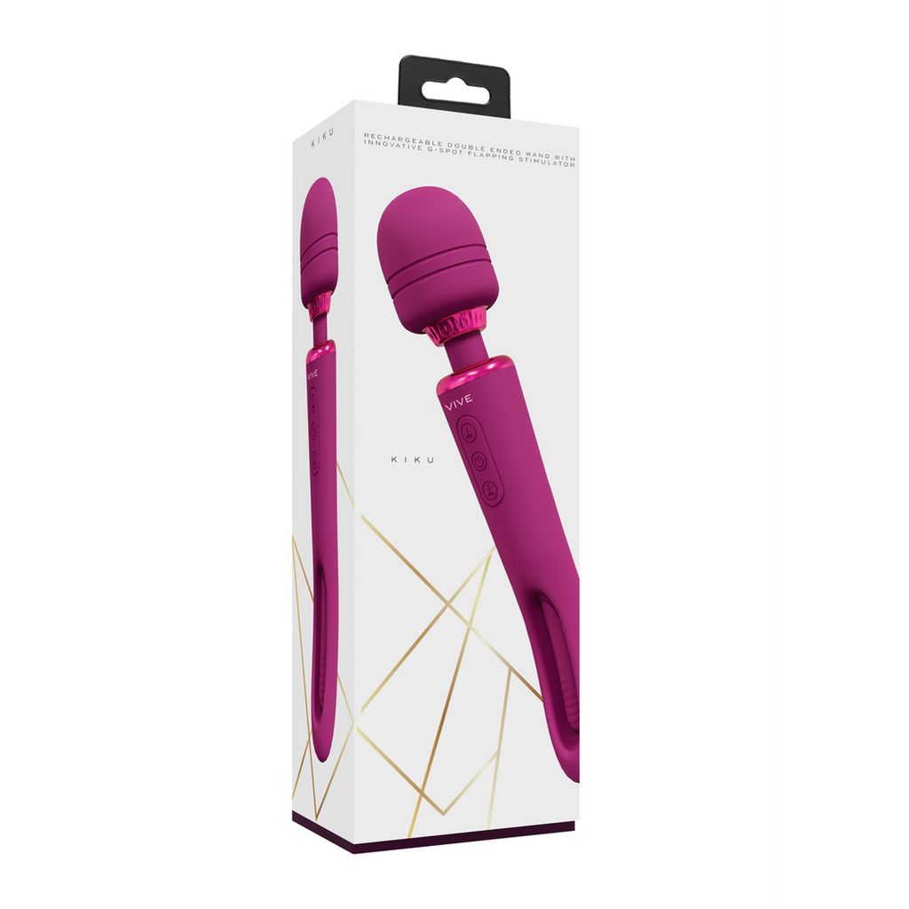 VIVE056 KIKU, dobbelt-ended, flapping tongue vibrator wand, har et 10-funktioners vibrerende wand-hoved og et 10-funktioners flapping tongue-håndtag, hvilket gør den til et allround perfekt nydelsesredskab. De 2 motorer giver dig over 100 mulige unikke indstillinger at lege med. Når du er tæt på klimaks, vil et enkelt tryk på tænd/sluk-knappen straks bringe alle motorerne op på fuld styrke/hastighed. Den er lavet af 100 % silkeblød silikone af medicinsk kvalitet, den er 100 % vandtæt (IPX6) og ekstremt støjsvag med under 60 db, hvilket betyder, at du kan bruge den, hvor end dit hjerte ønsker det. Den indeholder et USB-magnetisk genopladeligt litium-ion-batteri, der, når det er fuldt opladet med USB-kablet, giver 70 minutters lidenskabelig spilletid. Alle VIVE-produkter leveres med 1 års garanti.