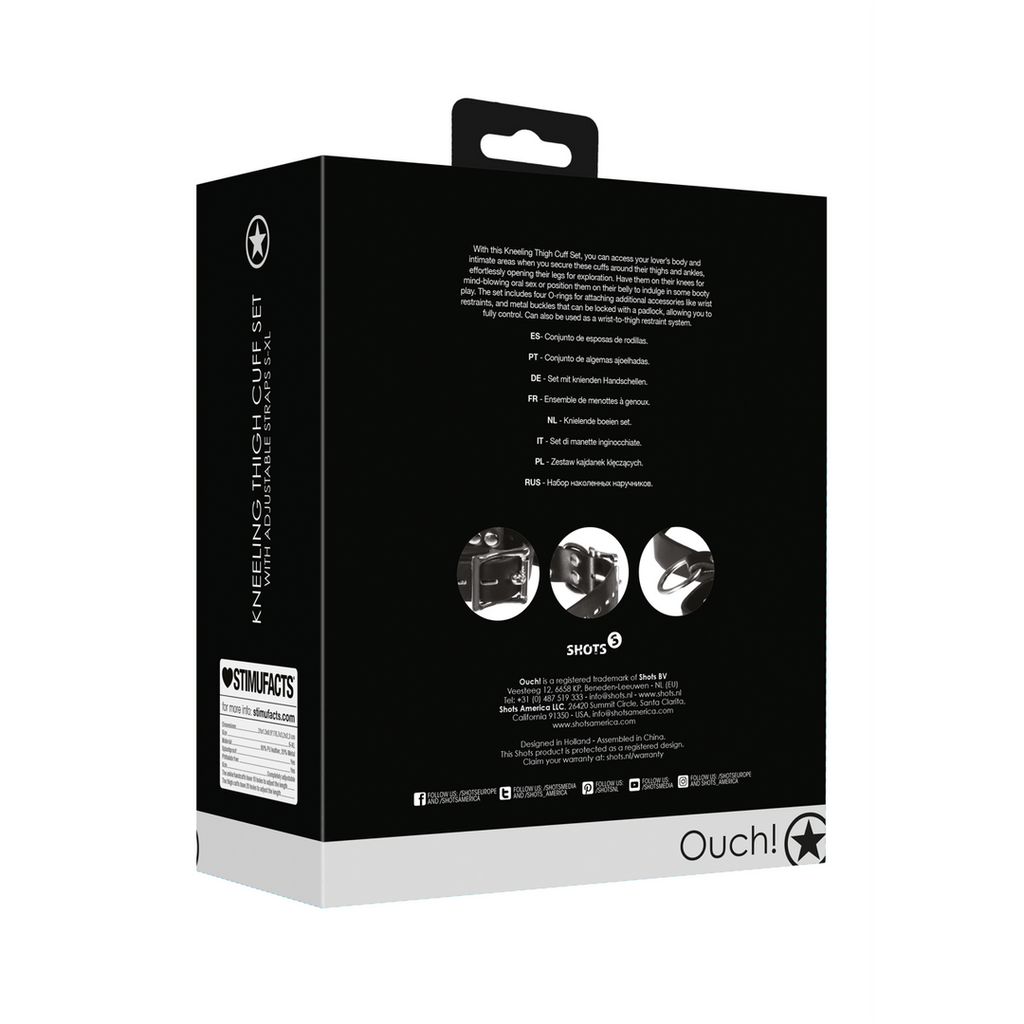 Med dette knælende lårmanchetsæt kan du få adgang til din elskedes krop og intime områder, når du fastgør disse manchetter omkring deres lår og ankler og nemt åbner deres ben for udforskning. Få dem ned på knæ for at få fantastisk oralsex, eller læg dem på maven for at lege med bagdelen. Sættet indeholder fire O-ringe til fastgørelse af ekstra tilbehør som håndledsbindinger og metalspænder, der kan låses med en hængelås, så du har fuld kontrol. Kan også bruges som et håndled-til-lår-fastspændingssystem.