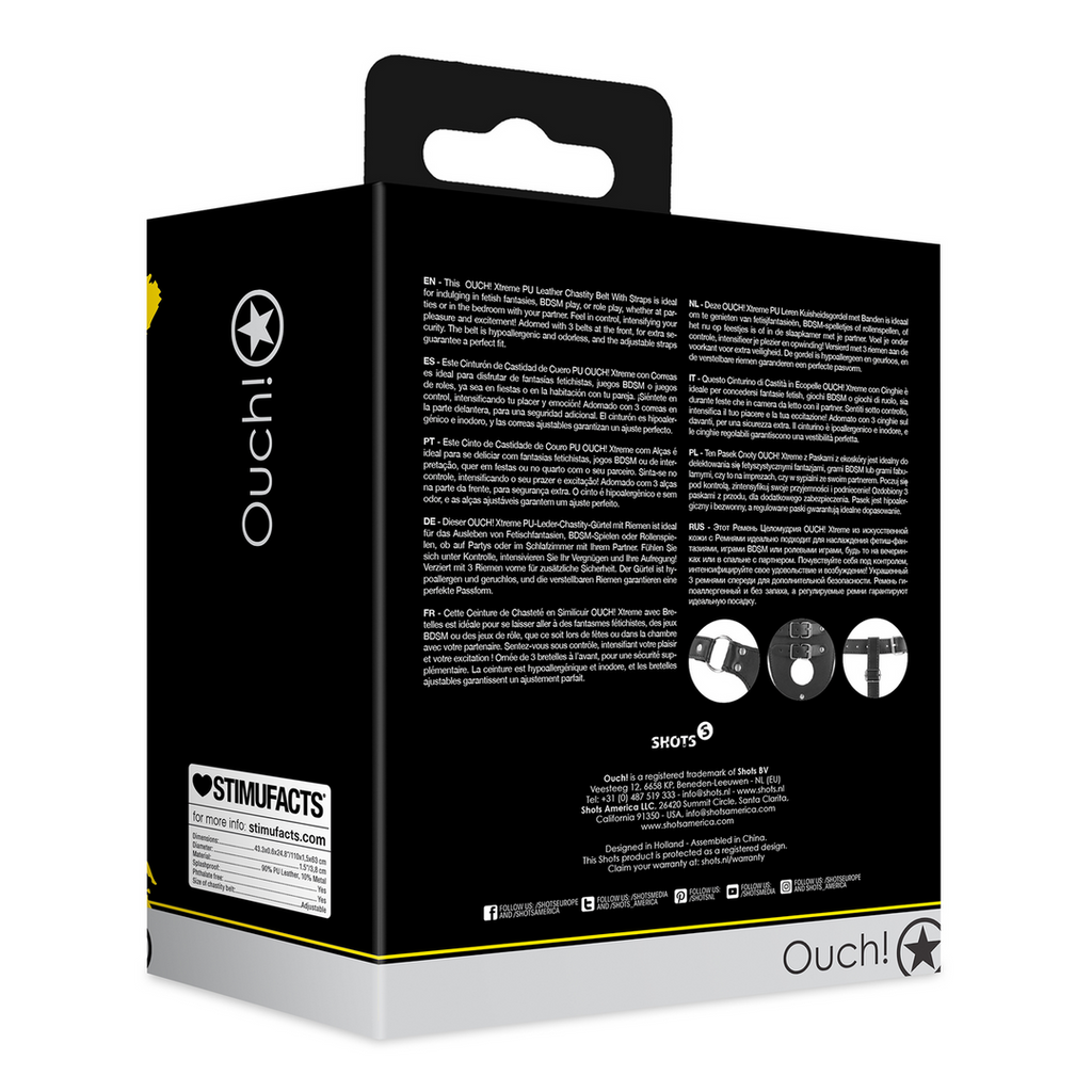 Dette OUCH! Xtreme PU-læder kyskhedsbælte med stropper er ideelt til at give sig hen til fetich-fantasier, BDSM-leg eller rollespil, hvad enten det er til fester eller i soveværelset med din partner. Føl dig i kontrol, og intensiver din nydelse og spænding! Udsmykket med 3 bælter foran for ekstra sikkerhed. Bæltet er allergivenligt og lugtfrit, og de justerbare stropper garanterer en perfekt pasform.