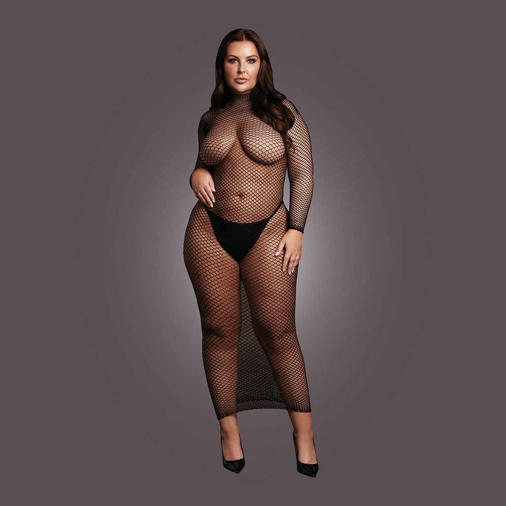 Elegant langærmet kjole med rullekrave og netmønster. Kan bæres i din foretrukne længde. Det bløde og superelastiske stof passer til størrelserne XL til 4XL.