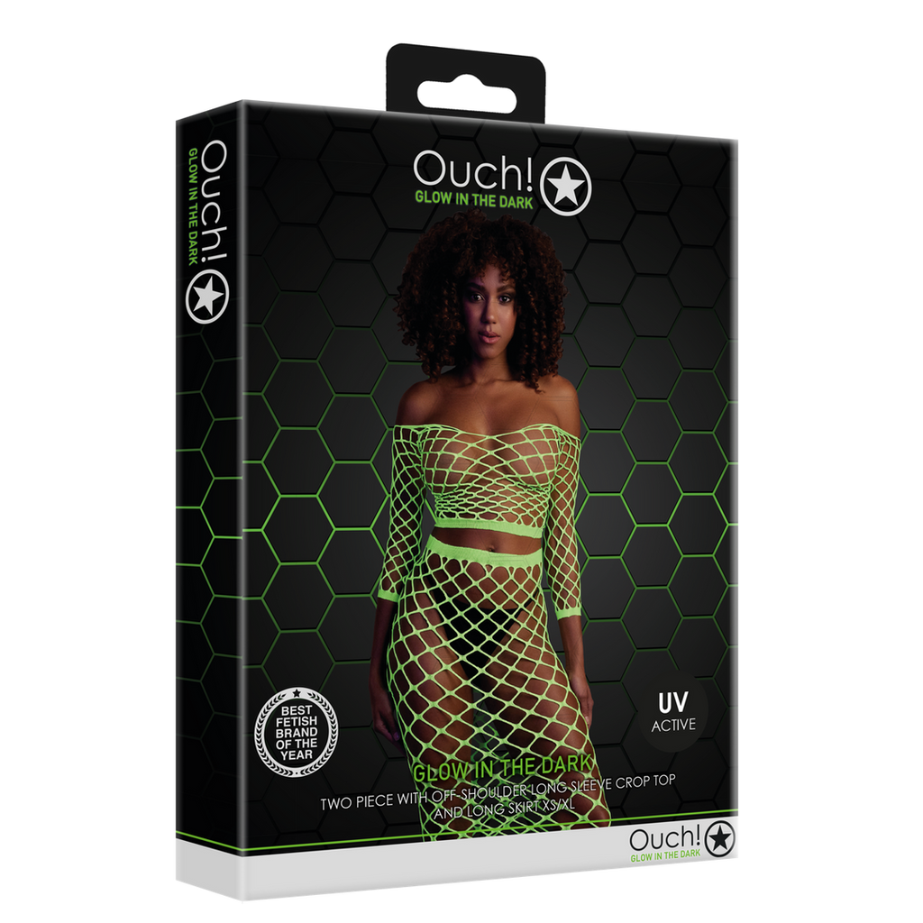 Vores Neon-undertøj er den perfekte tilføjelse til din samling. De er lavet af behagelige, elastiske materialer, der er nemme at passe, og de er designet til at passe perfekt til din krop. Uanset om du bruger dem som festtøj eller lingeri, vil dette iøjnefaldende stykke sørge for, at du skiller dig ud! Slip din indre gudinde løs med dette fantastiske UV-aktiverede lingeri. Dette stykke består af en off shoulder langærmet crop top og lang nederdel. Et fantastisk festtøj, der giver dig wow-faktor og får dig til at skille dig ud. De UV-aktiverede materialer tilføjer et strejf af mystik og tiltrækningskraft. Let at passe på grund af de strækbare materialer, der får dig til at lyse op i natten. Fås i neonpink og neongrøn. Størrelserne går fra XS/XL til XL/XXXXL