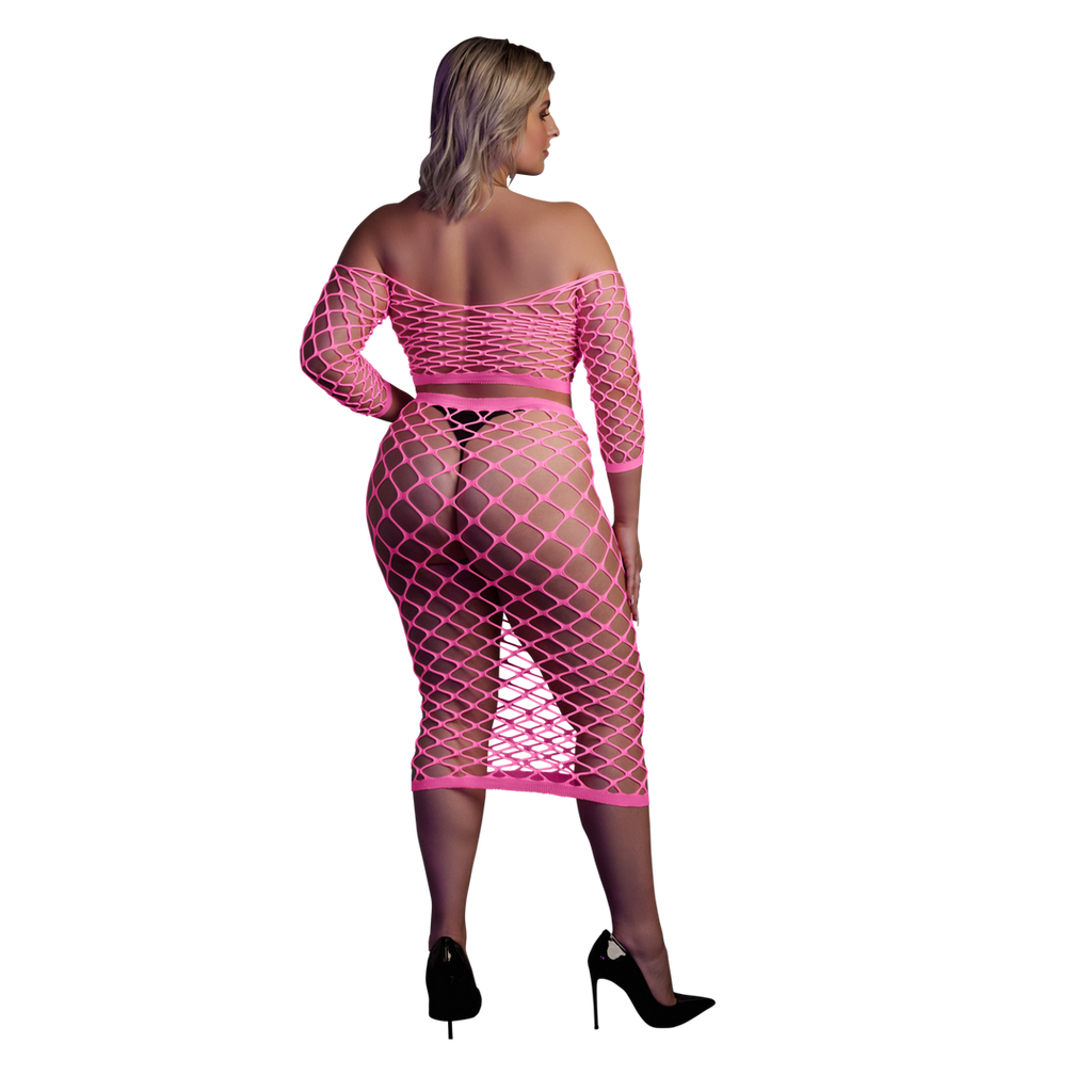 Langærmet Crop Top og lang nederdel - Plus Size - Neon Pink
