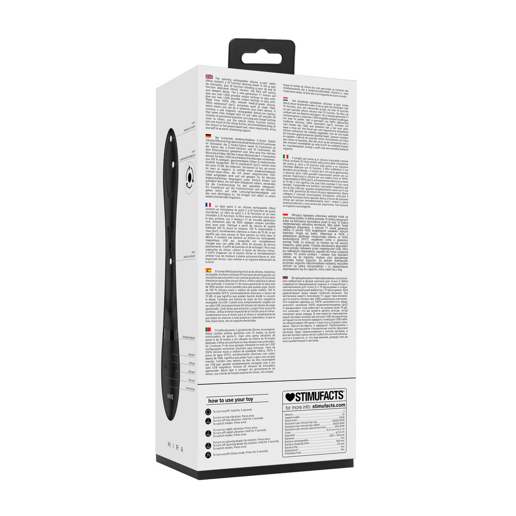 MIRA, multifunktionel G-punktskanin i silikone, har en G-punktsspidsstimulator med 10 funktioner fyldt med roterende perler, plus en vibrerende G-punktsspids med 10 funktioner og en dedikeret klitorisvibrator med 10 funktioner, hvilket gør den til en kraft, man skal regne med! De 3 motorer giver dig over 1.000 mulige unikke indstillinger at lege med, hvilket gør MIRA til et kraftcenter af sjov. Den er lavet af 100 % silkeblød silikone af medicinsk kvalitet, er 100 % vandtæt (ipx7) og ekstremt støjsvag med under 60 dB, hvilket betyder, at ingen behøver at vide, hvad du laver. Den indeholder et usb-magnetisk genopladeligt litium-ion-batteri, der, når det er fuldt opladet med usb-kablet, giver 50 minutters lidenskabelig spilletid. Bare sæt stikket i og oplad! Når du er tæt på klimaks, vil et enkelt tryk på klimaks-knappen med specialfunktion straks bringe alle motorerne op på fuld kraft/hastighed og, endnu vigtigere, bringe dig til en jordrystende orgasme.