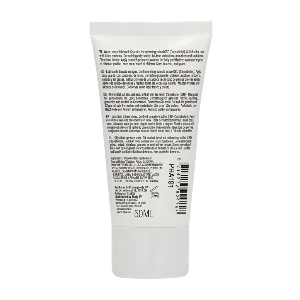 Vandbaseret glidecreme. Indeholder den aktive ingrediens CBD (cannabidiol), velegnet til brug med latexkondomer. Dermatologisk testet, fedtfri, farveløs, lugtfri og uden smag. Brugsanvisning: Påfør så meget gel, som du vil, på den ønskede kropsdel, og gentag så ofte, du vil. Opbevares utilgængeligt for børn. Opbevares på et køligt, mørkt sted.