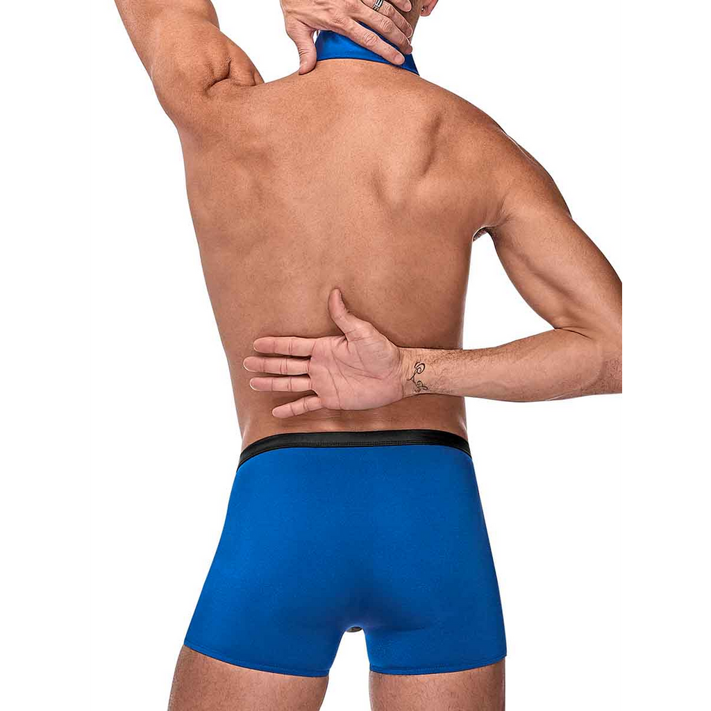 Fra Costumes-kollektionen af Male Power, denne stil inkluderer: Et tredelt sæt med en short med kontrastpose, funktionel lynlås med beskyttende foring, O-ring og linning i cire, et clip-on-badge og en krave med fastgjort slips.