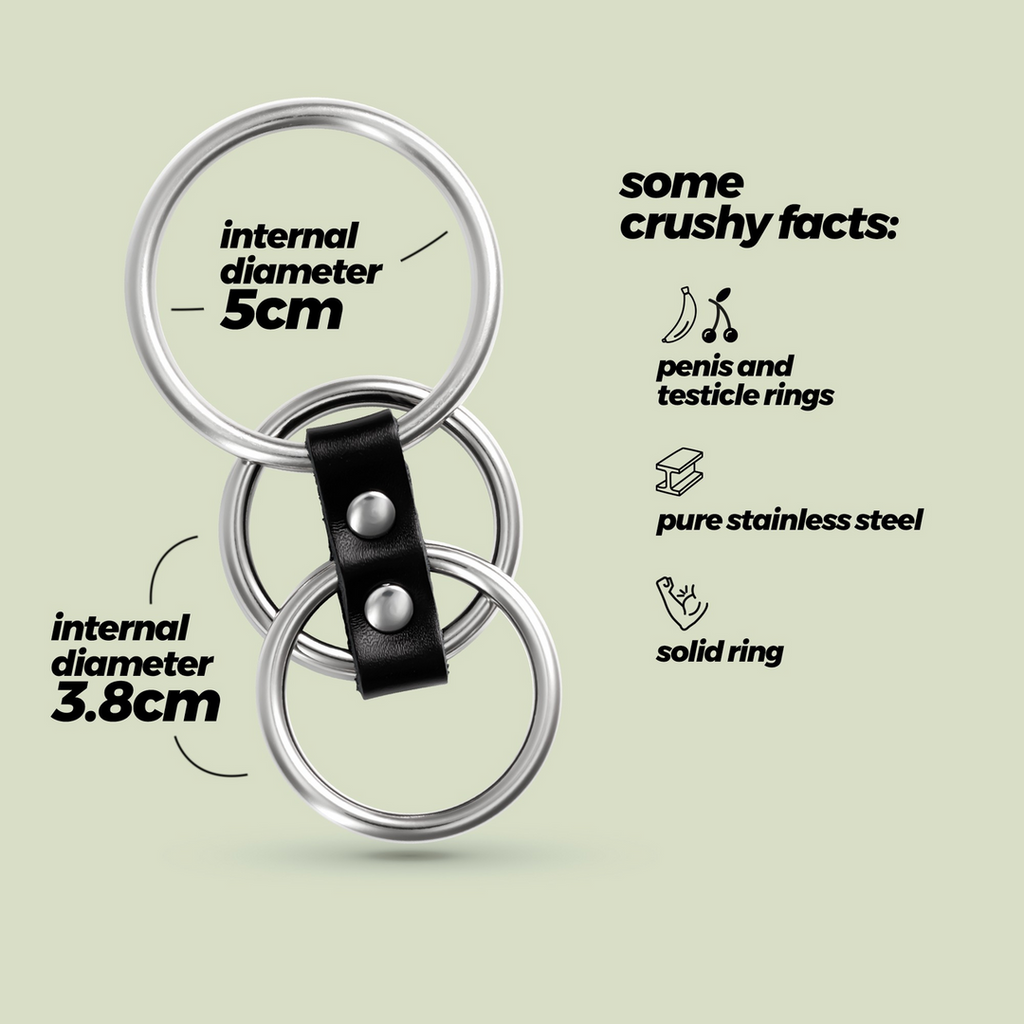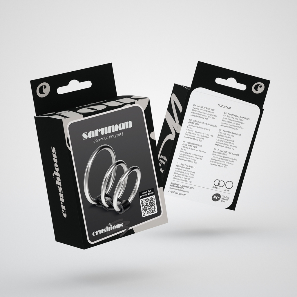 Er du på udkig efter et alsidigt og robust stykke legetøj? Saruman er ringen over dem alle! Et sæt med 3 ringe, der kan bruges til at gribe om dit skaft. 1 stykke legetøj, en verden af fornemmelser. Brug metallet til temperaturleg, læg ringene i nogle minutter i koldt eller varmt vand før brug. Vær forsigtig med ikke at bruge ringene i lange perioder. Rengøring er super nemt, vask med varmt vand og mild sæbe eller brug en rengøringsspray til legetøj. Brug antibakteriel rengøringsspray for det bedste resultat. Tør og opbevar væk fra lys- og varmekilder. Brug af glidecreme anbefales. Brug altid vandbaserede smøremidler. Olier og andre typer smøremidler kan beskadige materialets integritet.Crushious smøremidler er den bedste tilføjelse til dit Crushious legetøj.Dimensioner: Diameter: 3,8 cm 5 cm.materiale:Metal, PU.