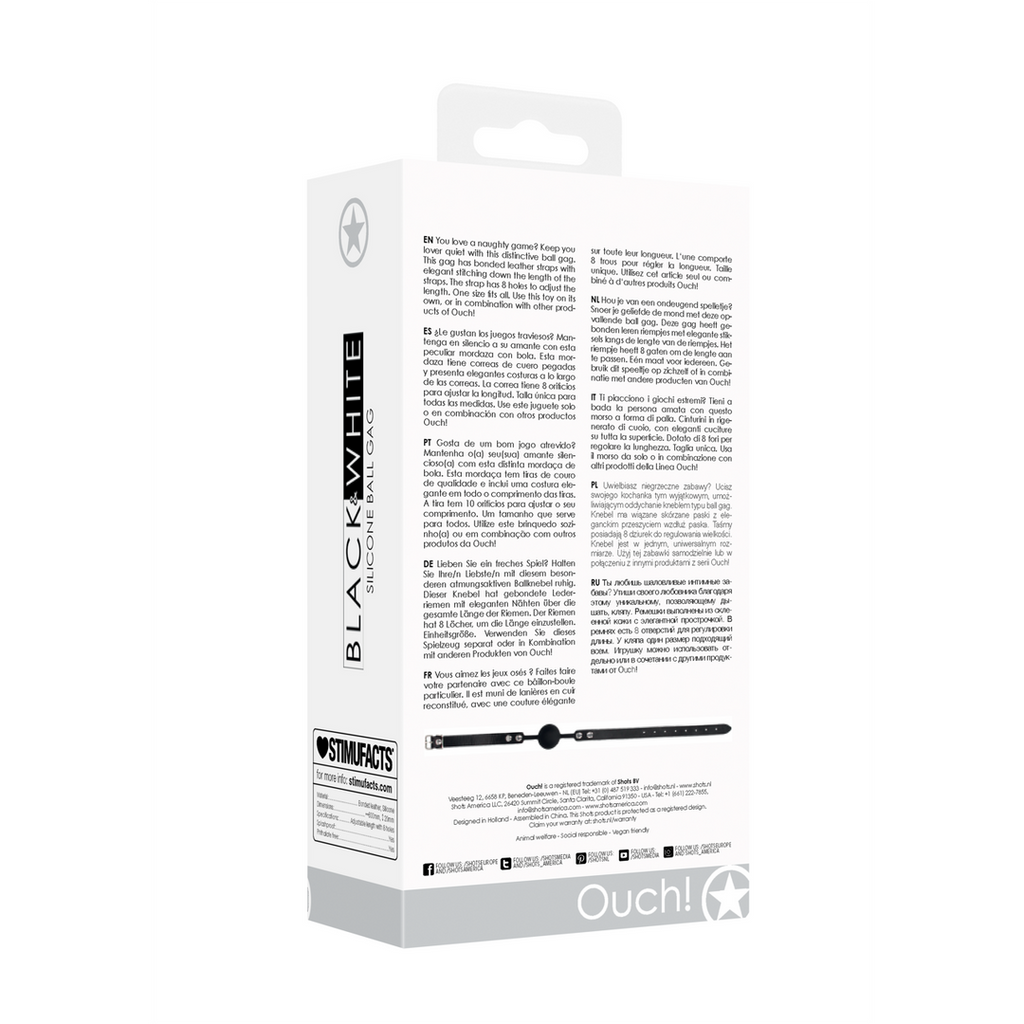 Elsker du en fræk leg? Hold din elsker stille med denne karakteristiske ball gag. Denne gag har kvalitetslæderstropper med elegante syninger ned langs stropperne. Remmen har 8 huller til at justere længden. En størrelse passer alle. Brug dette legetøj alene eller i kombination med andre produkter fra Ouch!