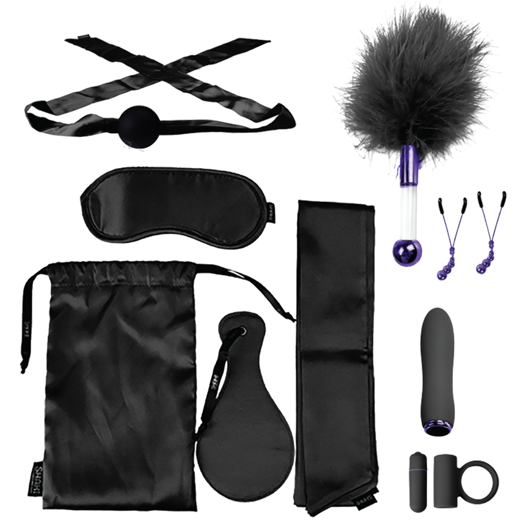 Alt, hvad du skal bruge til en fræk aften med BDSM-sjov, er her! Dette sæt med 11 dele indeholder følgende: et sæt brystvorteklemmer, en silikonevibrator med 10 hastigheder, en kildrer med imiteret fjer, 2 satinremme, en satinpaddel, et satinblindfold, en silikone-ball gag med satinremme, en 32 mm c-ring og en lille kugle med én hastighed, der passer perfekt til at få c-ringen til at vibrere. Derudover er der en matchende opbevaringspose i satin. Hele sættet er skabt i en matchende sort, så du kan mikse det med resten af din Merci-samling.