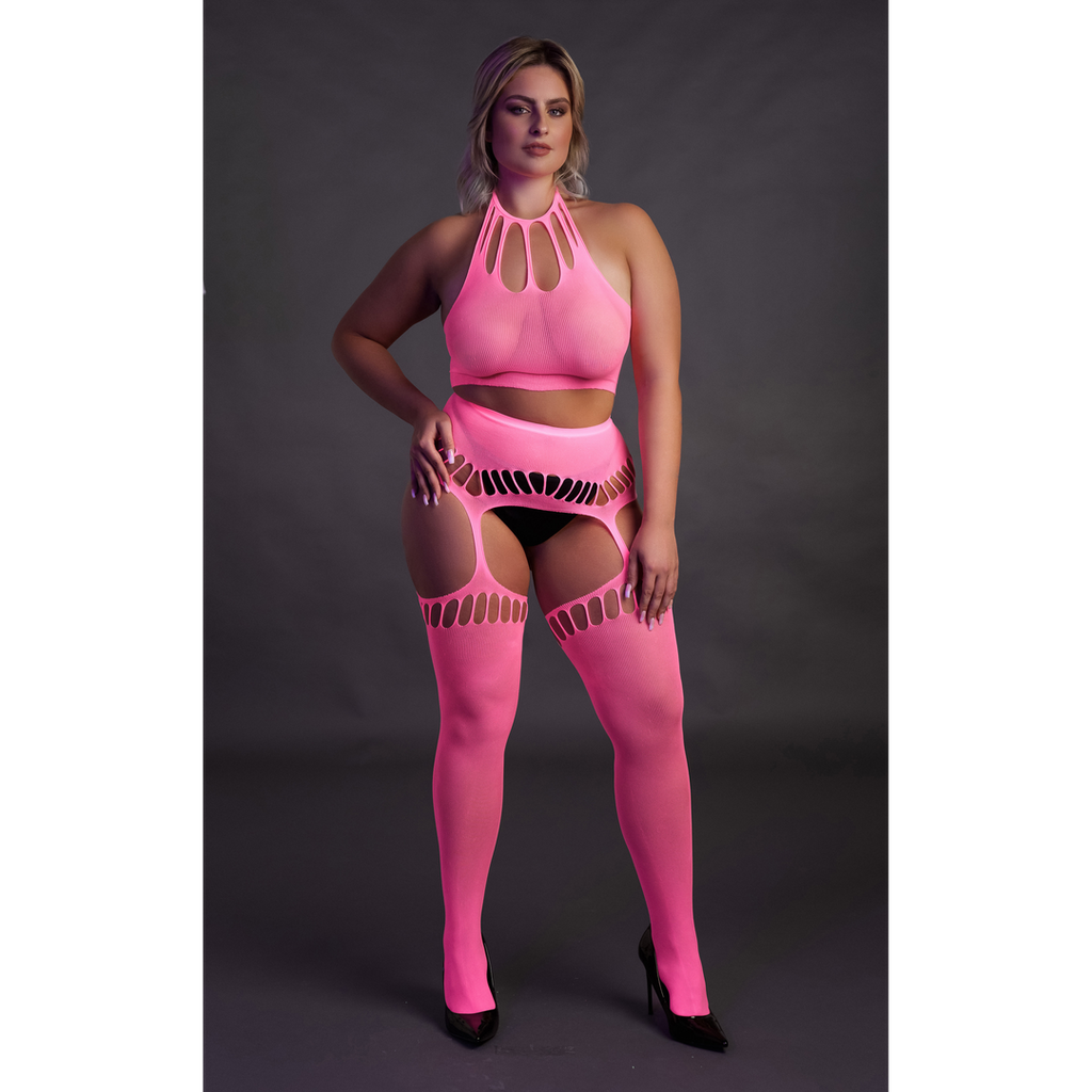 Vores Neon-undertøj er den perfekte tilføjelse til din samling. De er lavet af behagelige, elastiske materialer, der er nemme at passe, og de er designet til at passe perfekt til din krop. Uanset om du bruger dem som festtøj eller lingeri, vil dette iøjnefaldende stykke sørge for, at du skiller dig ud! Slip din indre gudinde løs med dette fantastiske UV-aktiverede lingeri. Dette stykke består af en halterneck crop top og strømpebåndstrømper. Et fantastisk festtøj, der giver dig wow-faktor og får dig til at skille dig ud. De UV-aktiverede materialer giver et strejf af mystik og tiltrækningskraft. Let at passe på grund af de strækbare materialer, der får dig til at lyse op i natten. Fås i neonpink og neongrøn. Størrelserne går fra XS/XL til XL/XXXXL