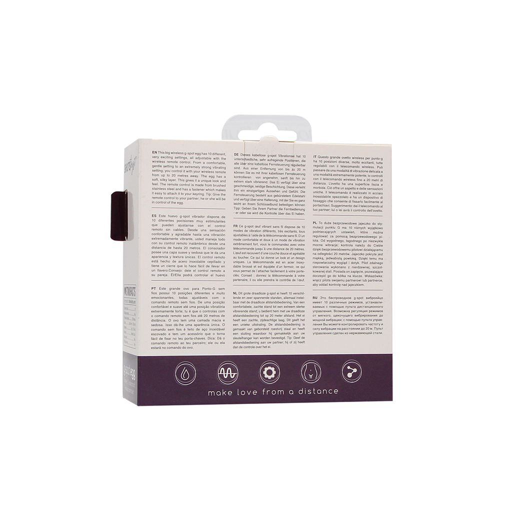 Dette store trådløse g-punktsæg har 10 forskellige, meget spændende indstillinger, som alle kan justeres med den trådløse fjernbetjening. Fra en behagelig, blid position til en ekstremt stærk vibrerende position, som du styrer med din trådløse fjernbetjening fra op til 20 meters afstand.ægget har et blødt, silkeagtigt lag. Det giver det et unikt udseende og en unik fornemmelse. Fjernbetjeningen er lavet af børstet rustfrit stål og har en fastgørelse, som gør det nemt at sætte den fast på din nøglering. Tip: Giv fjernbetjeningen til din partner, så har han eller hun kontrol over ægget.