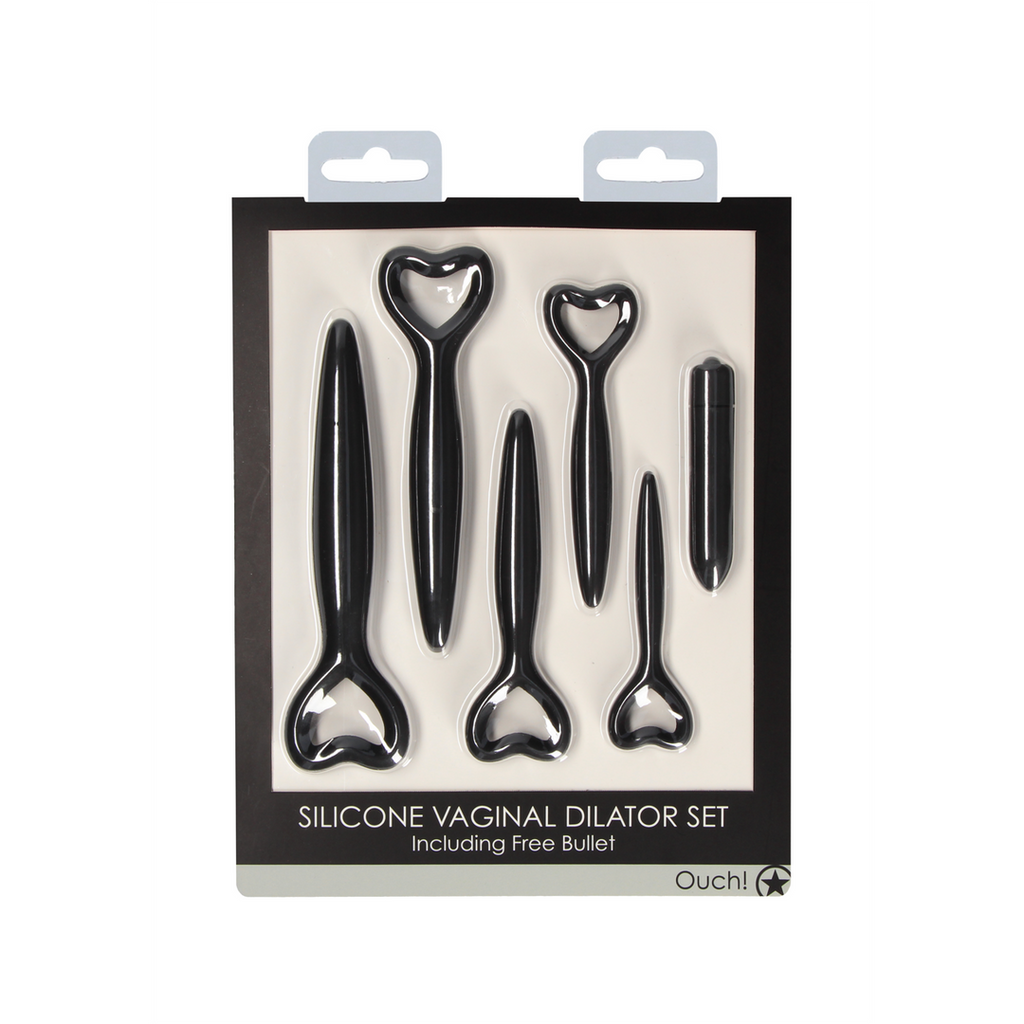Brug af en vaginal dilatator er en anbefalet behandling for at gøre penetrationen lettere. Dette sæt indeholder 5 dilatatorer i forskellige størrelser, fremstillet af silkeblød silikone, som gør indføringen let og smidig. Begynd med den mindste dilatator i Ouch! dilatatorsættet, sørg for at påføre lidt vandbaseret glidecreme, og før den forsigtigt og gradvist ind i skeden. Øvelsen kan udføres dagligt med små, blide bevægelser ind og ud. Formålet med Ouch! Vaginal Dilator-sættet er at få det vaginale område til at slappe af og lindre ubehag. Når du kan indføre den mindste dilator komfortabelt og uden ubehag, er du klar til at gå op til næste størrelse. Sættet kommer også med en gratis vibrerende bullet-klimaks-maskine, der er lavet til din fornøjelse.