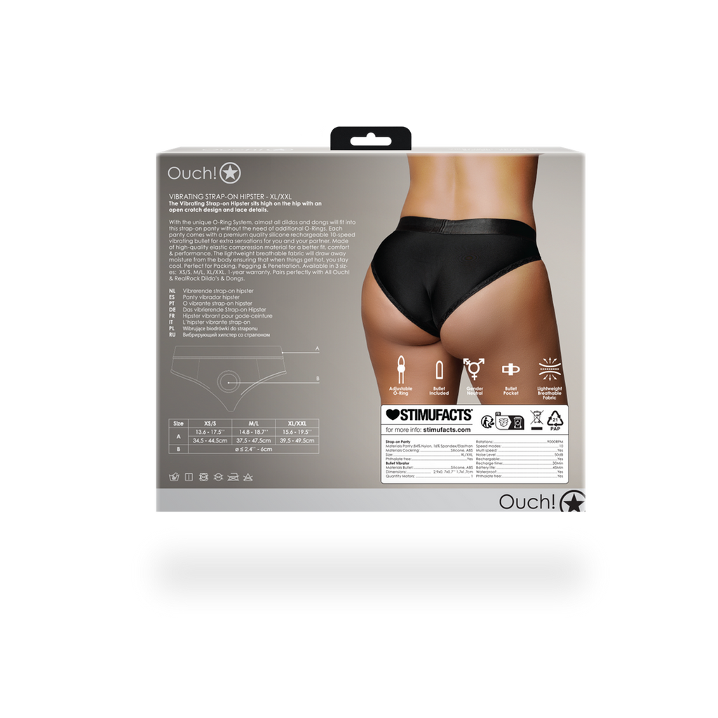 Vibrating Strap-on Hipster sidder højt på hoften med et åbent skridtdesign og blondedetaljer. Disse enkle, men elegante strap-on-trusser er perfekte til dig og din partner. Du skal ikke bekymre dig om komplicerede stropper og spænder, bare tag dem på, tilføj legetøjet og nyd det. Med en række forskellige stilarter, former og størrelser kan alle finde deres perfekte pasform. Med det unikke O-ringsystem passer næsten alle dildoer og dong'er i denne strap-on-trusse uden behov for ekstra O-ringe. Hver trusse leveres med en genopladelig 10-speed vibrerende bullet i silikone af høj kvalitet, som giver ekstra fornemmelser for dig og din partner. Fremstillet af elastisk kompressionsmateriale af høj kvalitet for bedre pasform og komfort. Det lette, åndbare stof trækker fugt væk fra kroppen og sikrer, at du forbliver kølig, når det bliver varmt. Perfekt til pakning og penetrering. Fås i 3 størrelser: XS/S, M/L, XL/XXL. 1 års garanti. Passer perfekt sammen med All Ouch! RealRock Dildo's Dongs.