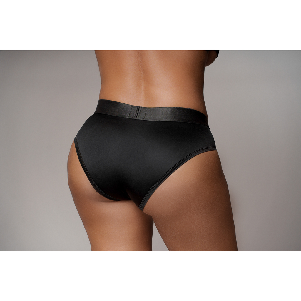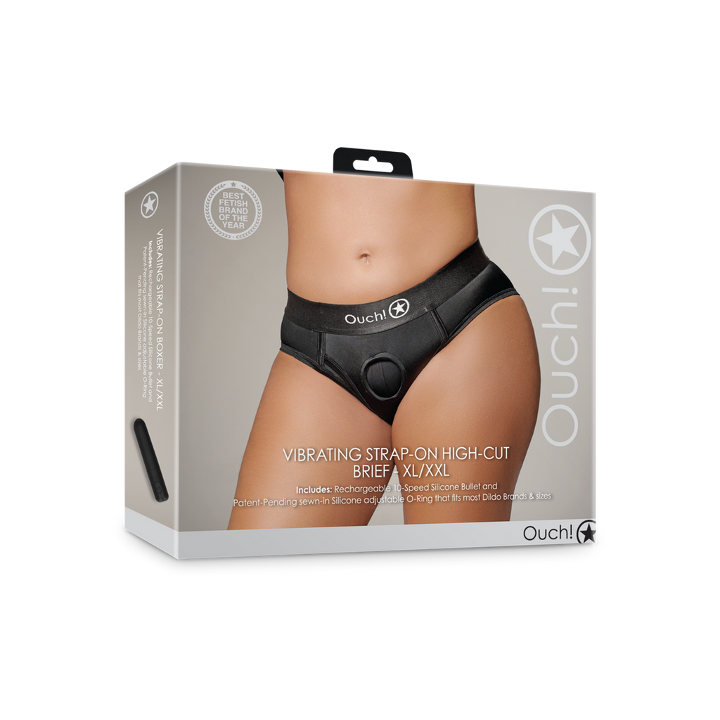 Vibrating Strap-on High-cut Brief sidder højt på låret og ind til hoften. Disse enkle, men elegante strap-on-trusser er perfekte til dig og din partner. Du skal ikke bekymre dig om komplicerede stropper og spænder, bare tag dem på, tilføj legetøjet og nyd det. Med en række forskellige stilarter, former og størrelser kan alle finde deres perfekte pasform. Med det unikke O-ringsystem passer næsten alle dildoer og dong'er i denne strap-on-trusse uden behov for ekstra O-ringe. Hver trusse leveres med en genopladelig 10-speed vibrerende bullet i silikone af høj kvalitet, som giver ekstra fornemmelser for dig og din partner. Fremstillet af elastisk kompressionsmateriale af høj kvalitet for bedre pasform og komfort. Det lette, åndbare stof trækker fugt væk fra kroppen og sikrer, at du forbliver kølig, når det bliver varmt. Perfekt til pakning og penetrering. Fås i 3 størrelser: XS/S, M/L, XL/XXL. 1 års garanti. Passer perfekt sammen med All Ouch! RealRock Dildo's Dongs.