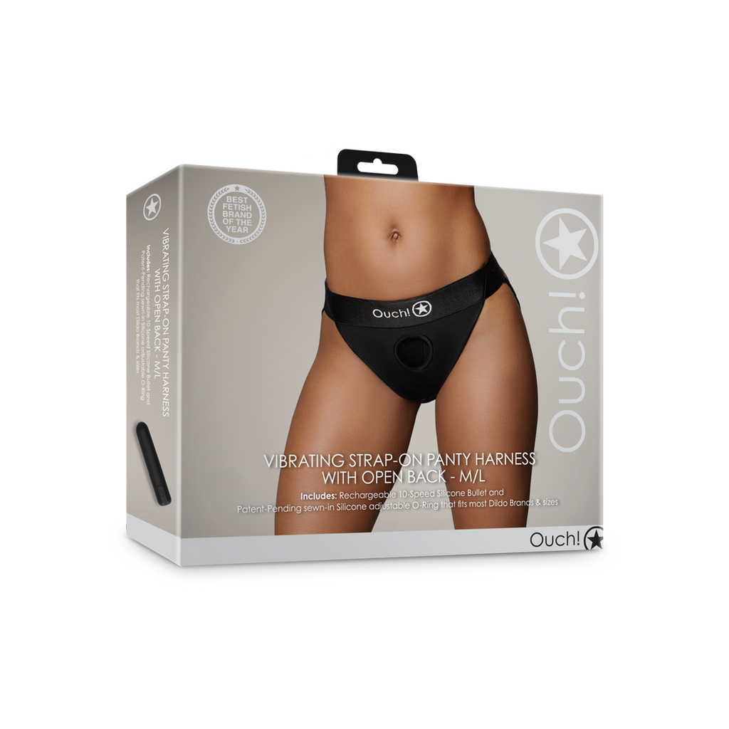Vibrating Strap-on Panty Harness with Open Back har stropper rundt om låret med en åben ryg og justerbare stropper, der går rundt om din numse. Disse enkle, men elegante strap-on-trusser er perfekte til dig og din partner. Du skal ikke bekymre dig om komplicerede stropper og spænder, bare tag dem på, tilføj legetøjet og nyd det. Med en række forskellige stilarter, former og størrelser kan alle finde deres perfekte pasform. Med det unikke O-ringsystem passer næsten alle dildoer og dong'er i denne strap-on-trusse uden behov for ekstra O-ringe. Hver trusse leveres med en genopladelig 10-speed vibrerende bullet i silikone af høj kvalitet, som giver ekstra fornemmelser for dig og din partner. Fremstillet af elastisk kompressionsmateriale af høj kvalitet for bedre pasform og komfort. Det lette, åndbare stof trækker fugt væk fra kroppen og sikrer, at du holder dig kølig, når det bliver varmt. Perfekt til pakning og penetrering. Fås i 3 størrelser: XS/S, M/L, XL/XXL. 1 års garanti. Passer perfekt sammen med All Ouch! RealRock Dildo's Dongs.